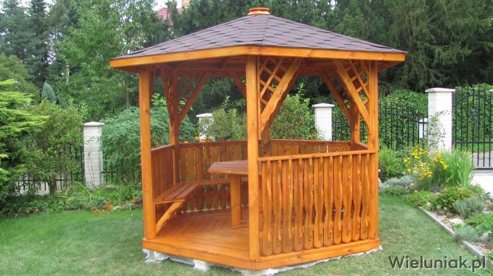 Altany ogrodowe wykonywane są z drewna sosnowego. Każda altana drewniana jest ustawiana na odpowiednio rozmieszczonych i wypoziomowanych podkładach betonowych, które zabezpieczają przed gromadzeniem się wody pod podłogą altany i zapewniają cyrkulację powietrza pod podłogą. Stosujemy również agrowłókninę, której zadaniem jest zapobieganie przerastaniu roślinności między deskami podłogowymi. Słupy altany mają wysokość 200 cm, natomiast całkowita wysokość altany wynosi 270 cm. Dachy altan wykonane są z desek boazeryjnych oraz pokryte gontem bitumicznym co zapewnia długoletnią trwałość każdej altany oraz odpowiednie wrażenia estetyczne. Każda z altan wyposażona jest w zestaw mebli, na który składają się stół z sześciokątnym blatem oraz 5 ławek, zamocowanych do altany. Wszystkie elementy altany są odpowiednio strugane oraz dwukrotnie impregnowane. Na życzenie klienta możemy zamontować w altanie oświetlenie oraz dodatkowe kratownice. Wszystkie altany montujemy samodzielnie. Dostarczamy nasze produkty na terenie Polski oraz zagranicę. Koszty transportu uzgadniamy indywidualnie z każdym klientem.