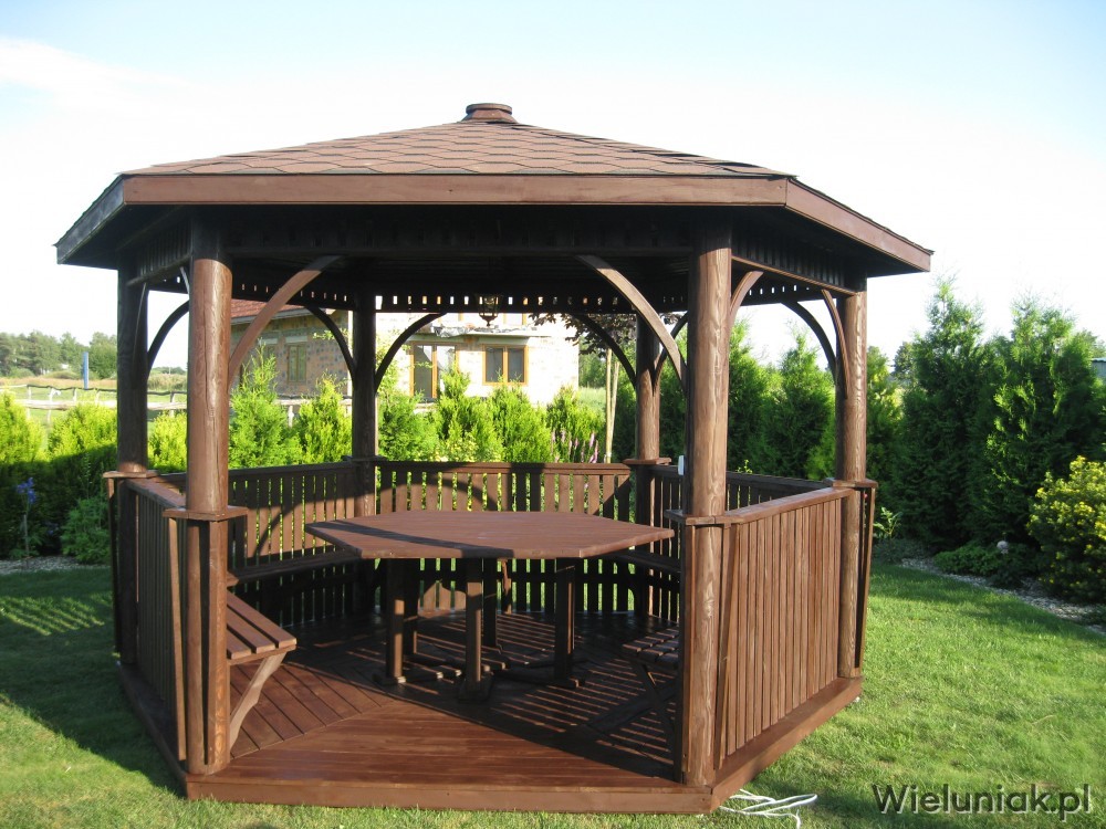 Altany ogrodowe wykonywane są z drewna sosnowego. Każda altana drewniana jest ustawiana na odpowiednio rozmieszczonych i wypoziomowanych podkładach betonowych, które zabezpieczają przed gromadzeniem się wody pod podłogą altany i zapewniają cyrkulację powietrza pod podłogą. Stosujemy również agrowłókninę, której zadaniem jest zapobieganie przerastaniu roślinności między deskami podłogowymi. Słupy altany mają wysokość 200 cm, natomiast całkowita wysokość altany wynosi 270 cm. Dachy altan wykonane są z desek boazeryjnych oraz pokryte gontem bitumicznym co zapewnia długoletnią trwałość każdej altany oraz odpowiednie wrażenia estetyczne. Każda z altan wyposażona jest w zestaw mebli, na który składają się stół z sześciokątnym blatem oraz 5 ławek, zamocowanych do altany. Wszystkie elementy altany są odpowiednio strugane oraz dwukrotnie impregnowane. Na życzenie klienta możemy zamontować w altanie oświetlenie oraz dodatkowe kratownice. Wszystkie altany montujemy samodzielnie. Dostarczamy nasze produkty na terenie Polski oraz zagranicę. Koszty transportu uzgadniamy indywidualnie z każdym klientem.