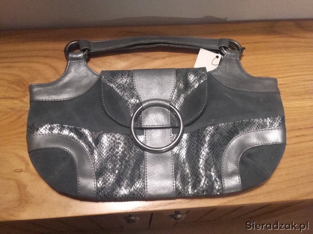 Piękna mała skórzana torebka !!! Zamsz w kolorze ciemno zielonym połączony z szarością i połyskującą skórką węża. Torba jest nowa firmy Ri2K London. POLECAM na prezent lub do codziennego użytkowania.