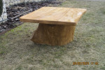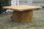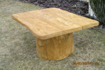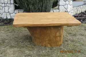 Stolik ogrodowy biesiadny wykonany jest z drewna liściastego o wymiarach 150 cm długości, 105 cm szerokości i 70 cm wysokości. Blat wykonany jest z deski grubości 6 cm, posadowiony jest na grubym pniu. Waga stolika wynosi ok 150 kg.