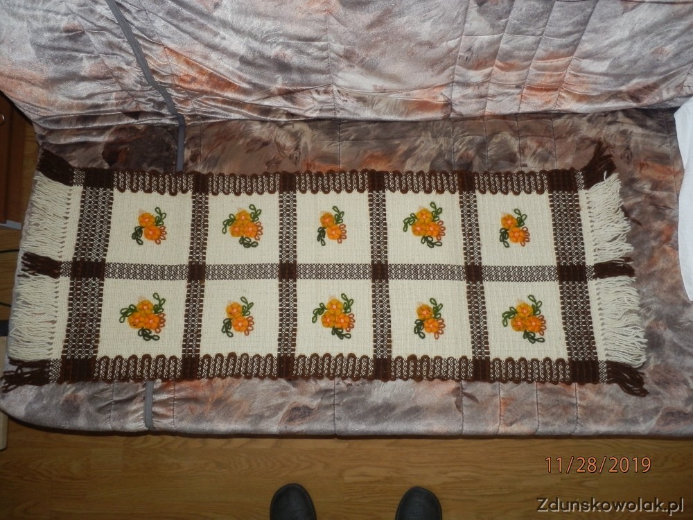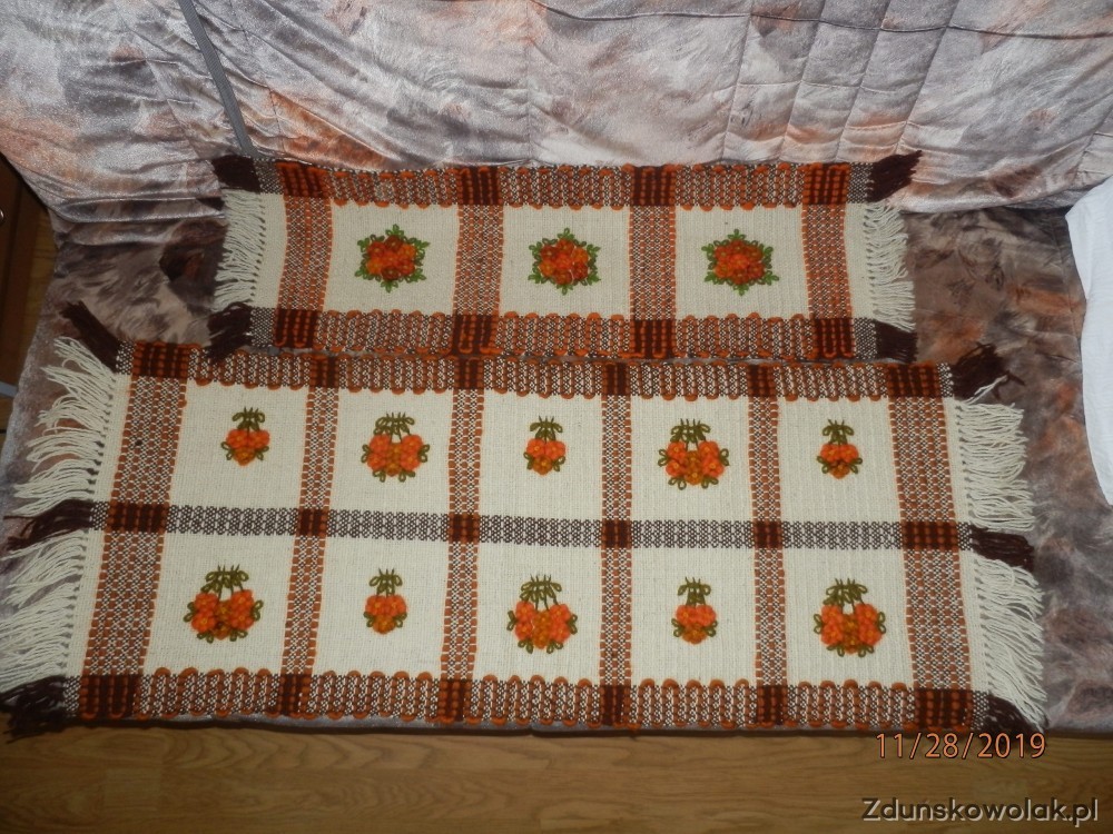 Przedmiotem sprzedaży jest jeden z wyrobów wełnianych tzw. cepeliowskich tj. obrus na stół /cena właśnie jego dotyczy/. Inne wyroby to bieżniki na ławę lub powłoczki na poduszki. Wszystkie kwiaty w kwadratach wyszywane ręcznie. Produkcja tych wyrobów już nie istnieje. Wyroby prezentowane na zdjęciach są nowe, nie używane i są w bardzo dobrym stanie. Zachęcam wszystkich lubiących w domku tego rodzaju dekoracje do zakupu, choćby na prezent dla osoby mającej do tych cepeliowskich wyrobów swoisty sentyment tamtych lat. Niestety są to już pojedyncze sztuki - na zdjęciach. Promocyjnie : wysyłka w cenie. Pozdrawiam i zapraszam do zakupu. Wymiary obrusu: 88x72 cm , bieżnika szerszego na ławę :113x40 cm, bieżnika wąskiego: 85x25 cm , wełnianej powłoczki na poduszkę : 47x56 cm.
