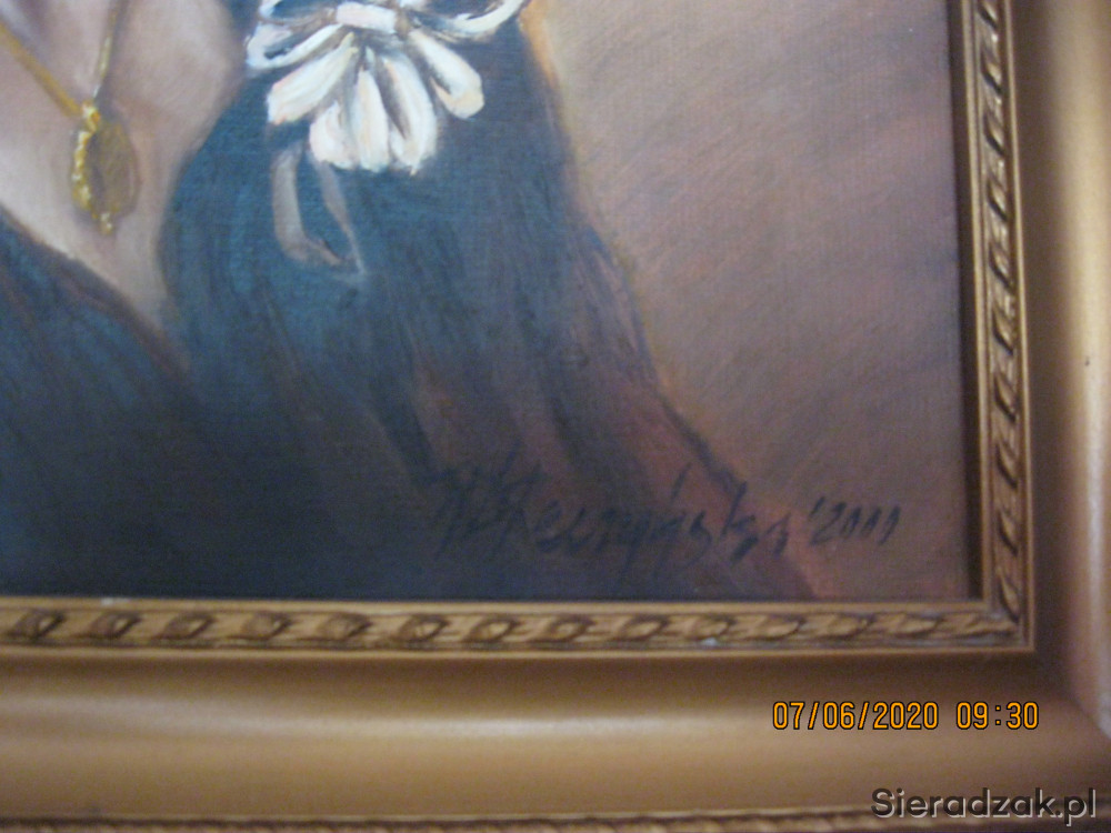 Sprzedam obraz olejny sygnowany przedstawiający portret kobiety. Wymiary obrazu bez ramy : 38 cm x 50 cm , z ramą 51,5 cm x 63 cm. Zapraszam do zakupu oraz obejrzenia pozostałe moje ogłoszenia.