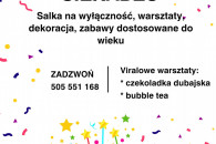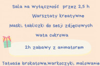 W naszej ofercie urodziny z warsztatami, zabawy z animatorem, tatuaż brokatowy, warkoczyki, jednorazowa zastawa stołowa.