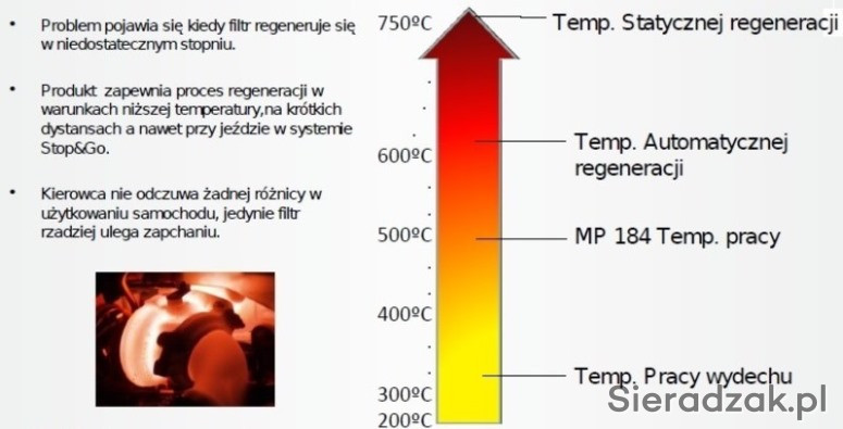 Produkt dodany do zbiornika paliwa trafia wraz z olejem napędowym do komory spalania, a następnie do filtra DPF. W komorze spalania produkt łączy się z cząsteczką sadzy, w wyniku czego w filtrze jej temperatura spalania obniża się do 450 0C.