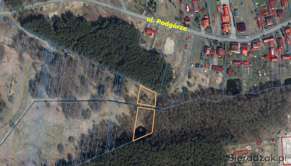 0,1900 ha - działka nie posiada dostępu do drogi publicznej o szerokości 32 m. Działka w kształcie trapezu, z brakiem możliwości podłączenia infrastruktury technicznej. Na działce znajdują się liczne nasadzenia oraz wykopany staw.