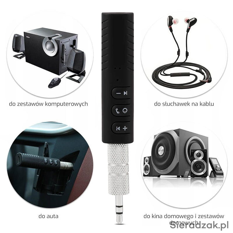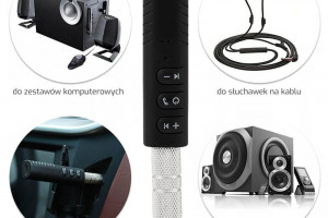 Odbiornik dźwięku Bluetooth umożliwiający bezprzewodowy odbiór muzyki za pośrednictwem funkcji Bluetooth lub poprzez adapter AUX dołączony w zestawie oraz Bezprzewodowy zestaw głośnomówiący.Niezwykle mały i poręczny oraz prosty w obsłudze.