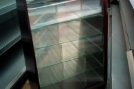 przód szyba gięta , szuflady pleksa, boki płyta meblowa.