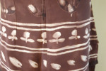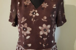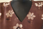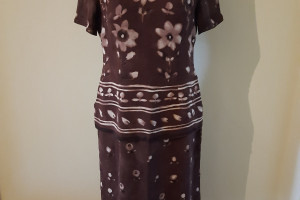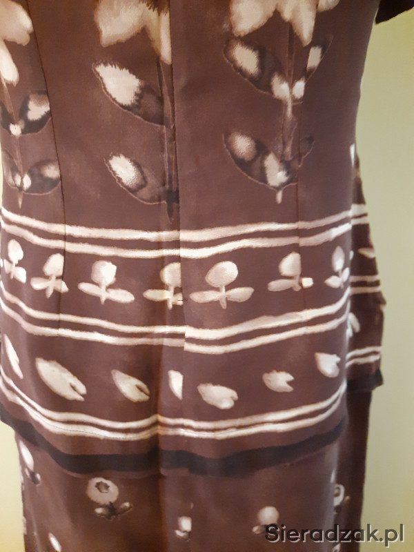 Oryginalna sukienka na podszewce w kolorze intensywnego brązu i wzorami w odcieniu ciepłej bieli i beżu. Rozmiar 44, zaprojektowana tak, że wygląda jak spódnica i bluzka, tkanina tworzywo sztuczne. Model dopasowany zaszewkami, wyszczuplający. Używana kilka razy, czysta i zadbana.