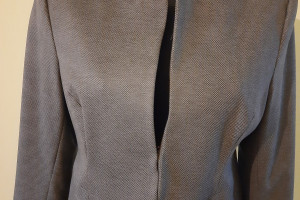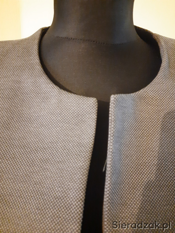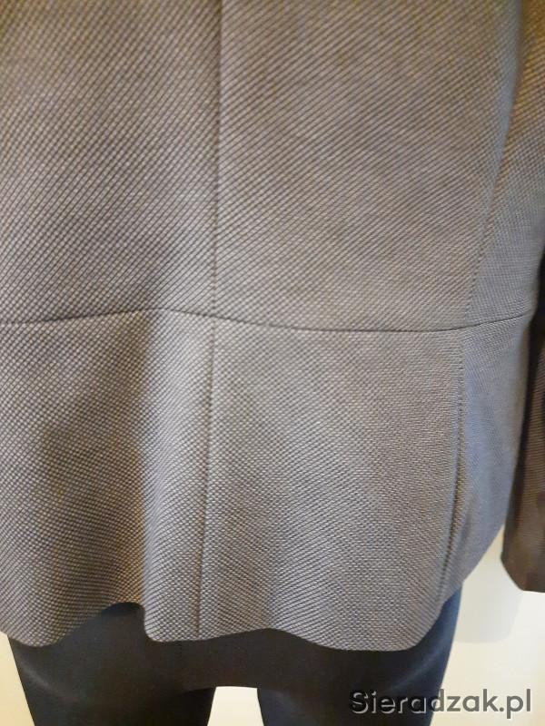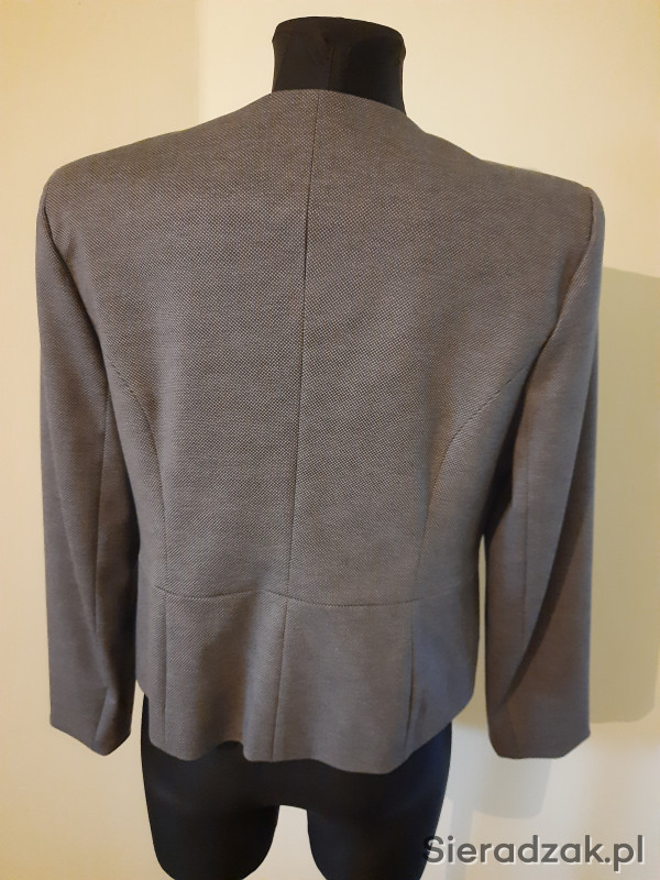Piękny, krótki żakiet na podszewce firmy QUIOSQUE , bez zapięcia z przodu i kołnierza, rozmiar 44. Lekka, miękka tkanina w kolorze odcieni szarości, czysty i zadbany, używany 2-3 razy. Polecam!