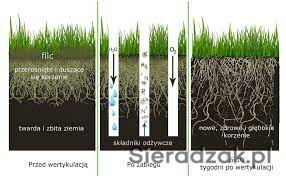 za pomocą wertyklatora nacinamy pionowo darń, przy czym wyczesujemy zalegający w niej filc. Wyciągniętniete w ten sposób źdźbła suchej nieprzydatnej trawy należy posprzątać- zgrabić