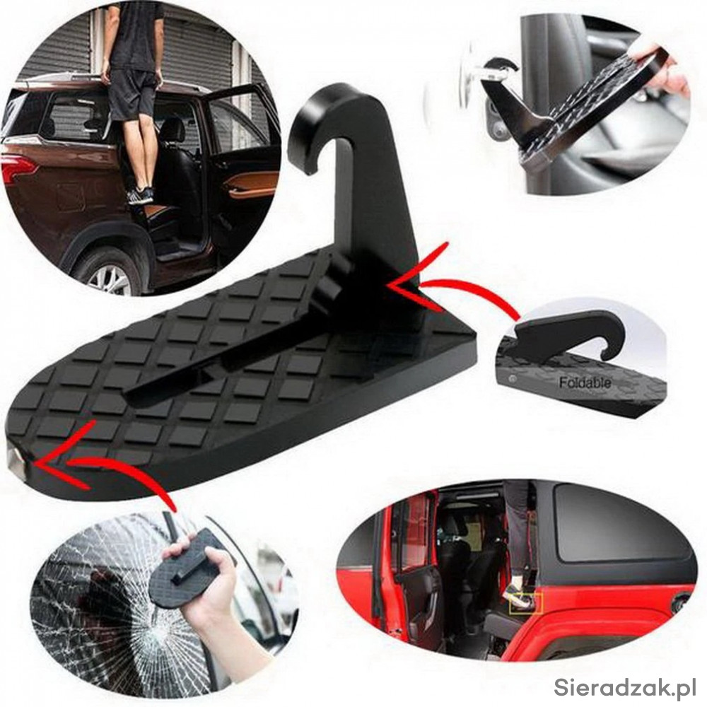 Stopień jest składany, przenośny, łatwy do przechowywania, zajmuje bardzo mało miejsca. Może być również używany jako młotek bezpieczeństwa do rozbijania szyby i klin pod koło samochodu.