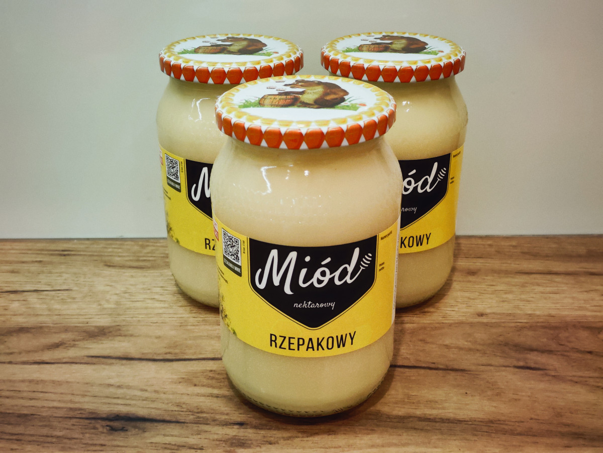 Najpopularniejszy miód w naszym kraju. Łatwo go rozpoznać po bardzo jasnym kolorze. Bardzo rzadko spotyka się go w postaci płynnej, ponieważ ze względu na dużą zawartość glukozy bardzo szybko krystalizuje. Aby móc cieszyć się płynnym miodem rzepakowym najlepiej kupować go w czasie jego wybierania, czyli na przełomie maja i czerwca. Niemniej skrystalizowany miód nie traci żadnych właściwości biotycznych, a podgrzewany aby posiadał postać płynną wiele traci.