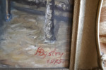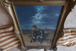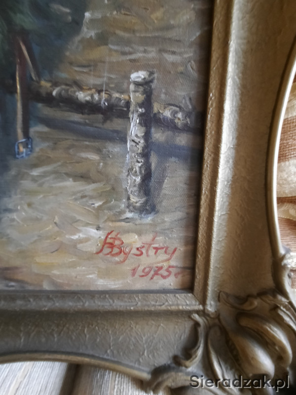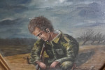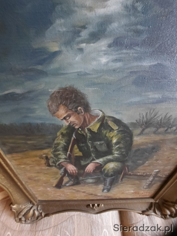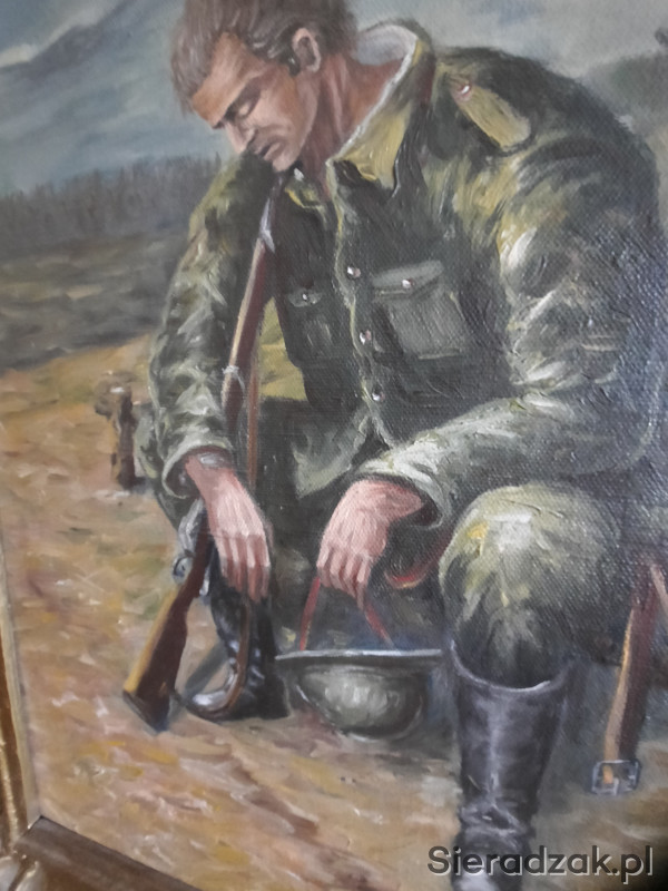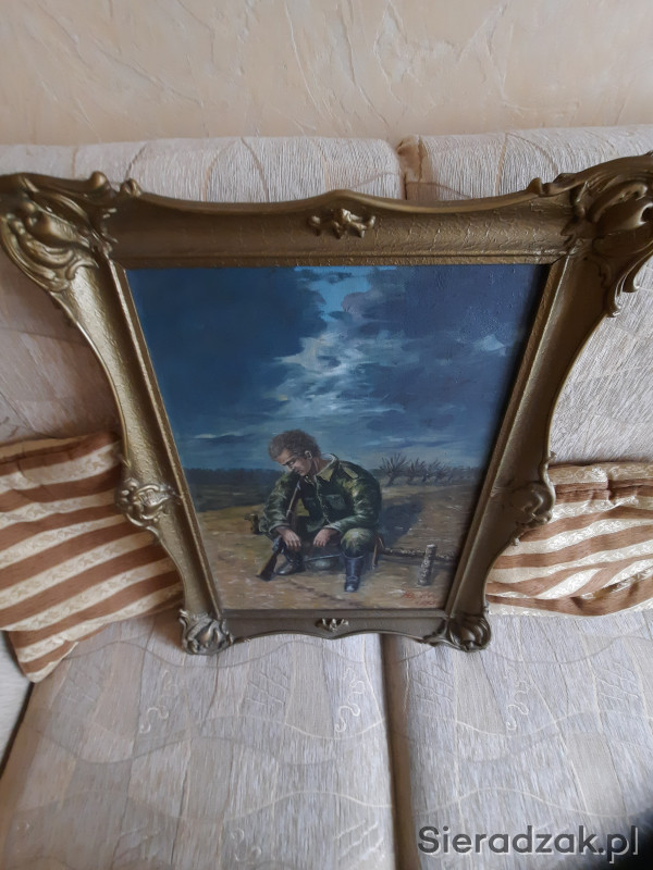 Obraz olejny na płótnie. Utrudzony żołnierz - legionista ? Złocona neobarokowa rama. Malarz - H. Bystry - 1075r. Wymiary 52 x 67 cm.