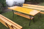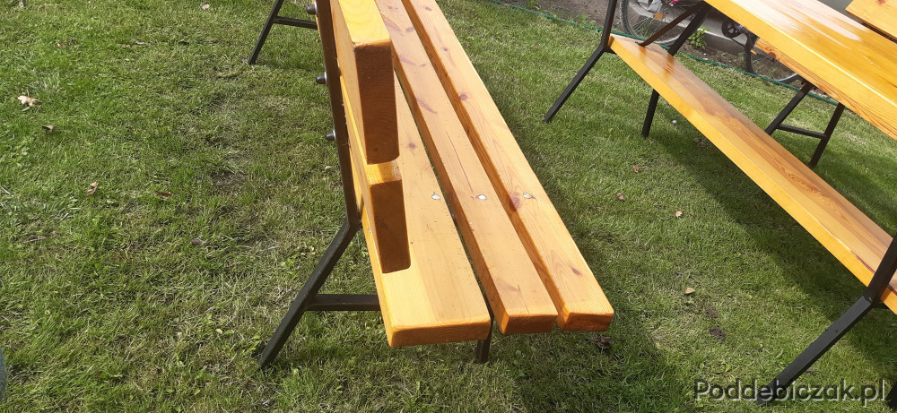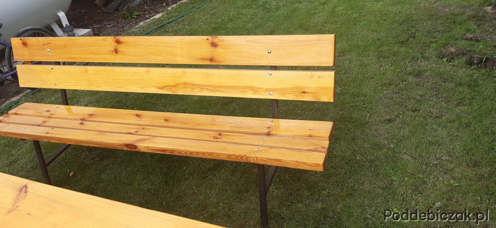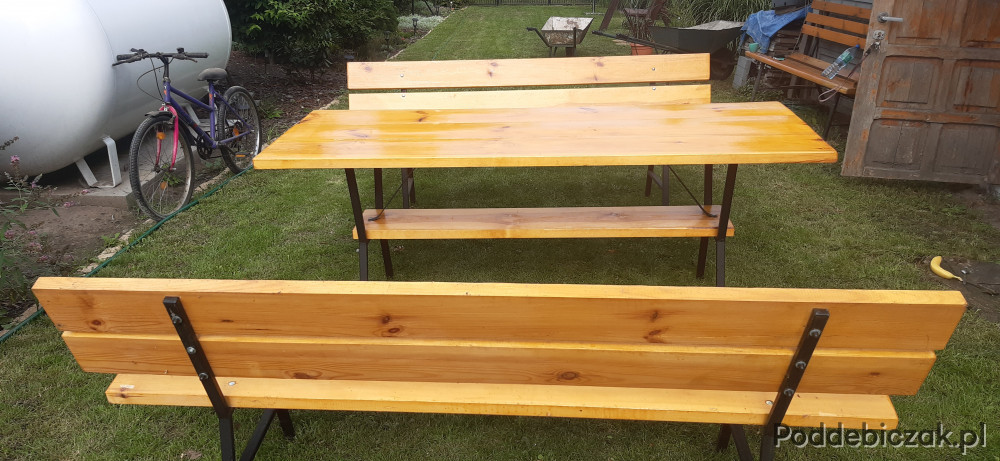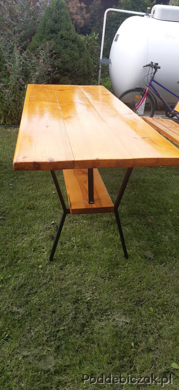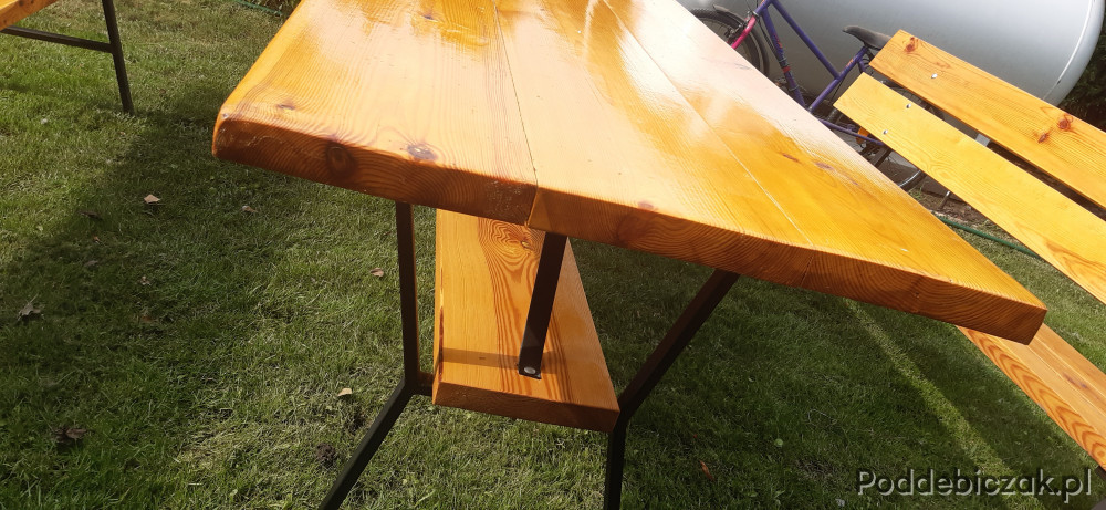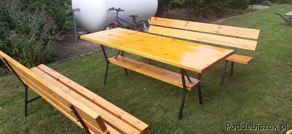 Do sprzedaży stół z dwoma ławkami o wymiarach:stół szerokość 2,02 m, głębokość 0,75 m, grubość desek 0,05 m, wysokość od podłoża 0,80 m, ławki szerokość 2,02 m, głębokość siedziska 0,37 m, wysokość siedziska od podłoża 0,48, , wysokość oparcia 0,39, grubość desek 0,05. Cały komplet lakierowany trzykrotnie. Stelaż ławek i stołu metalowy. Bardzo solidnie wykonane i bardzo trwałe. Polecam!