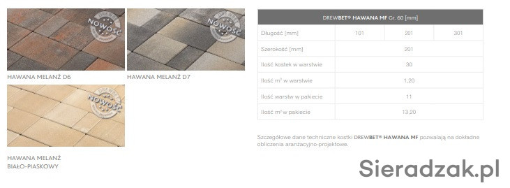Kostka DREWBET® HAWANA MF to modułowy bruk o gruboÊci 6 cm, na który składajà si´ trzy pasujàce wzajemnie do siebie kostki: 101x201; 201x201 i 201x301 [mm]. Nowoczesna i ponadczasowa forma kostki umo˝liwia zastosowanie jej w wielu miejscach, zarówno w obiektach u˝ytecznoÊci publicznej jak i w otoczeniu prywatnych posesji. Ponadto delikatne wykoƒczenie kraw´dzi za pomocà mikrofazy daje w efekcie koƒcowym równà powierzchni´, tym samym uzyskujemy mo˝liwoÊç zastosowania kostki Hawana na powierzchniach tarasowych. Bogata kolorystyka melan˝y kolorystycznych pozwoli na idealne dopasowanie do projektowanych przestrzeni wokół budynku.