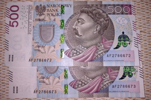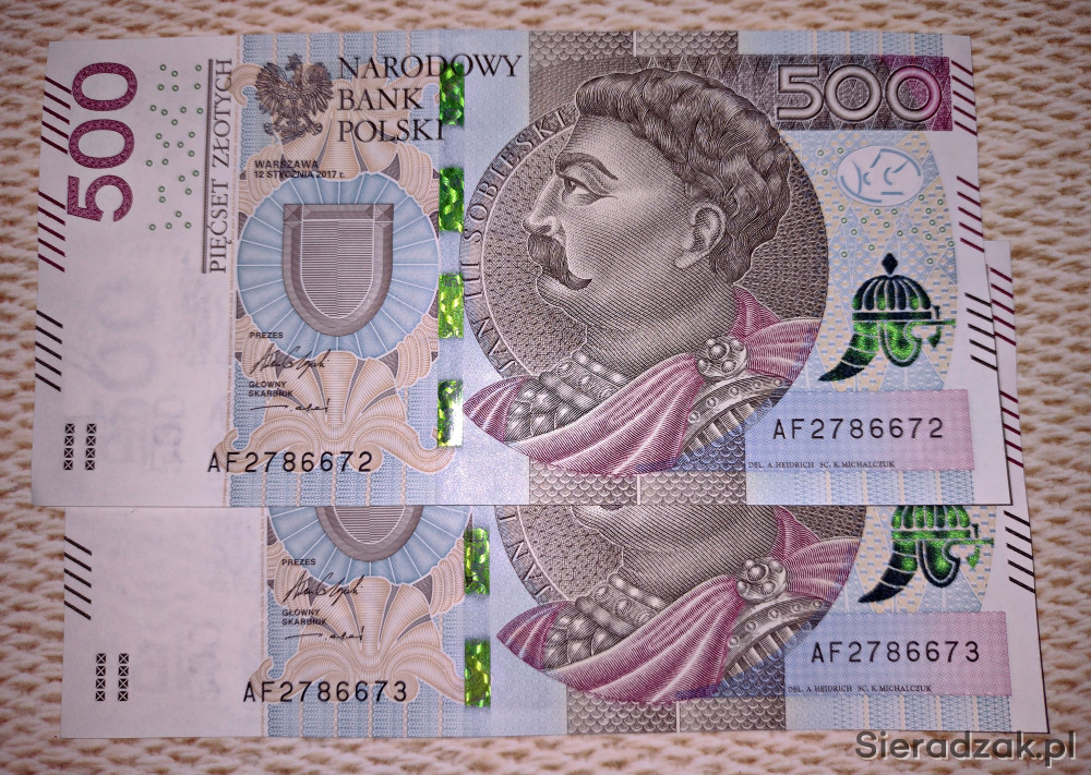 Dwa kolejne banknoty bankowe obiegowe o nominałach po 500 złotych, wyemitowane w 2017 roku.