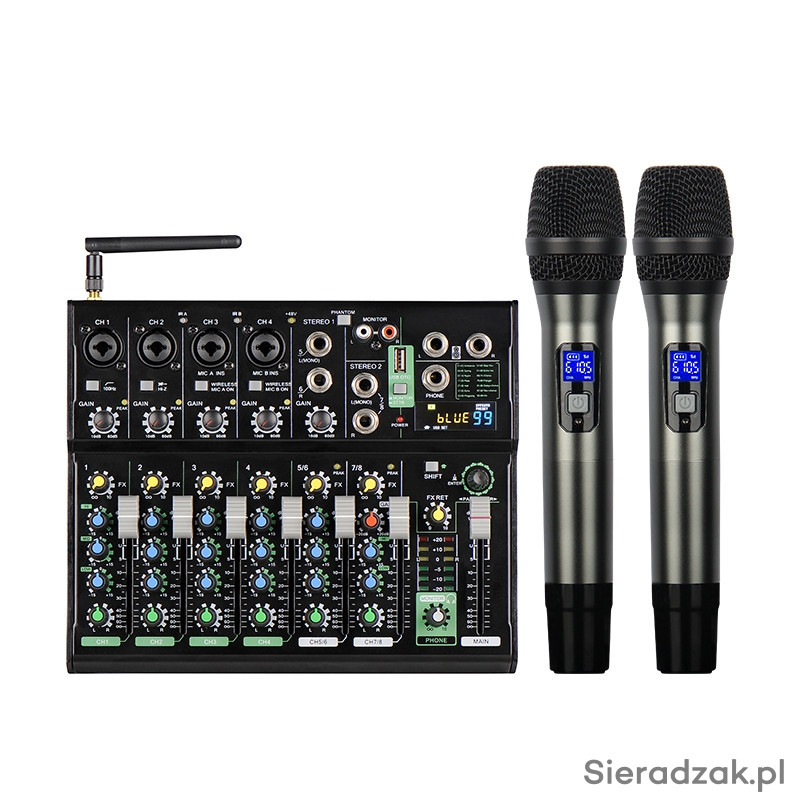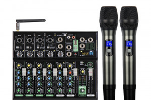 Mikser Audio z dwoma mikrofonami bezprzewodowymi do ręki UHF z efektami i Bluetooth oraz MP3 USB Pendrive.