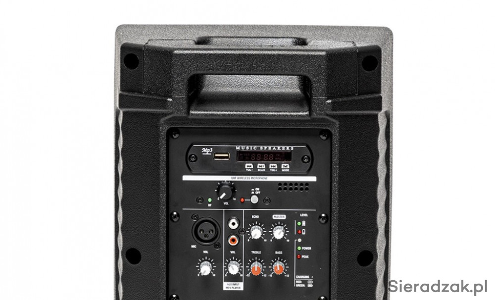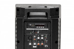 Przenośny system wzmacniający Stagg, z wbudowanym odtwarzaczem MP3 USB, odbiornikiem Bluetooth oraz jednym doręcznym mikrofonem bezprzewodowym.