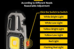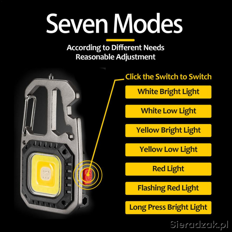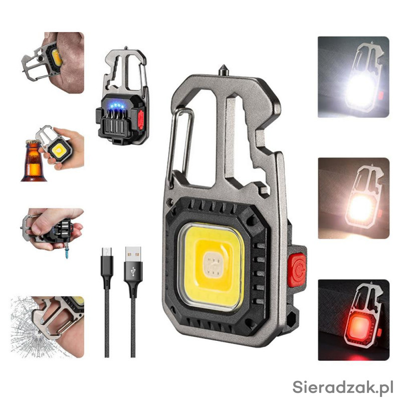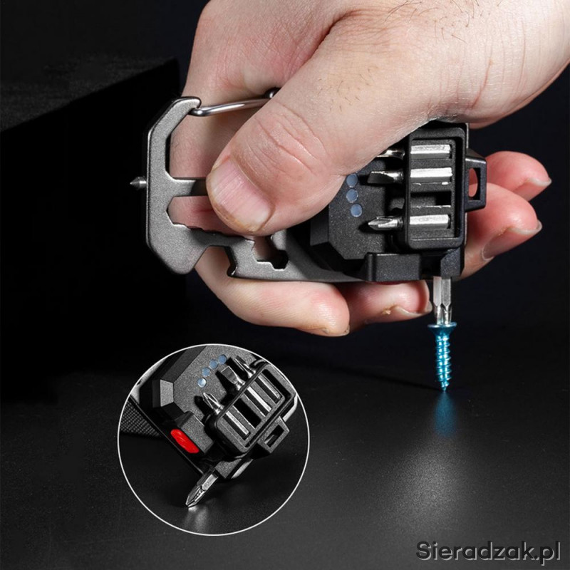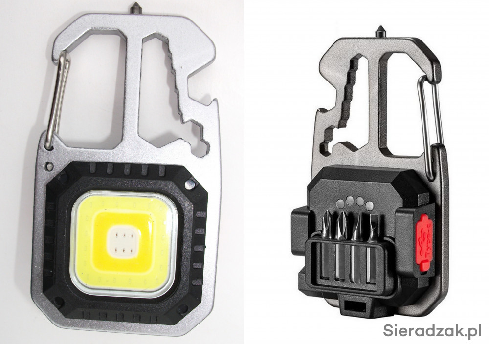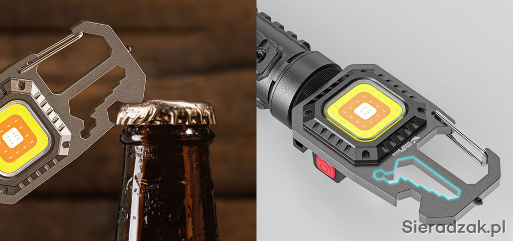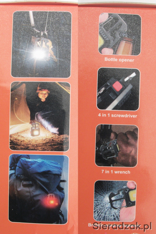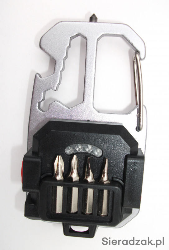 Dodatkowo latarka ma wbudowane kilka narzędzi: otwieracz butelek, karabińczyk, 4 groty wkrętaków z uchwytem śrubokręta, klucze do nakrętek i młotek do zbicia szyby.
