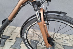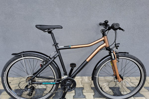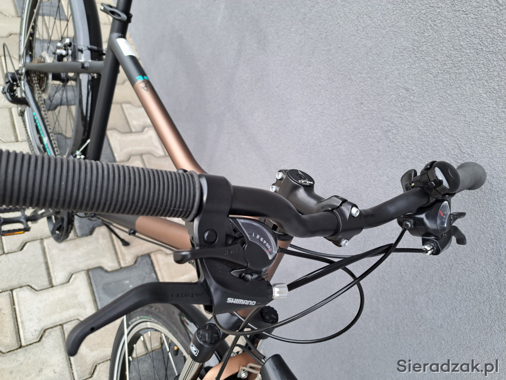 rama aluminium 6061 19" 49cm,napęd 3x7,przerzutki shimano tourney,klamkomanetki shimano,hamulce v-brake shimano,dynamo shimano nexus,oświetlenie led axa,opony schwalbe delta cruiser plus,amortyzaor sr suntour m3010.
