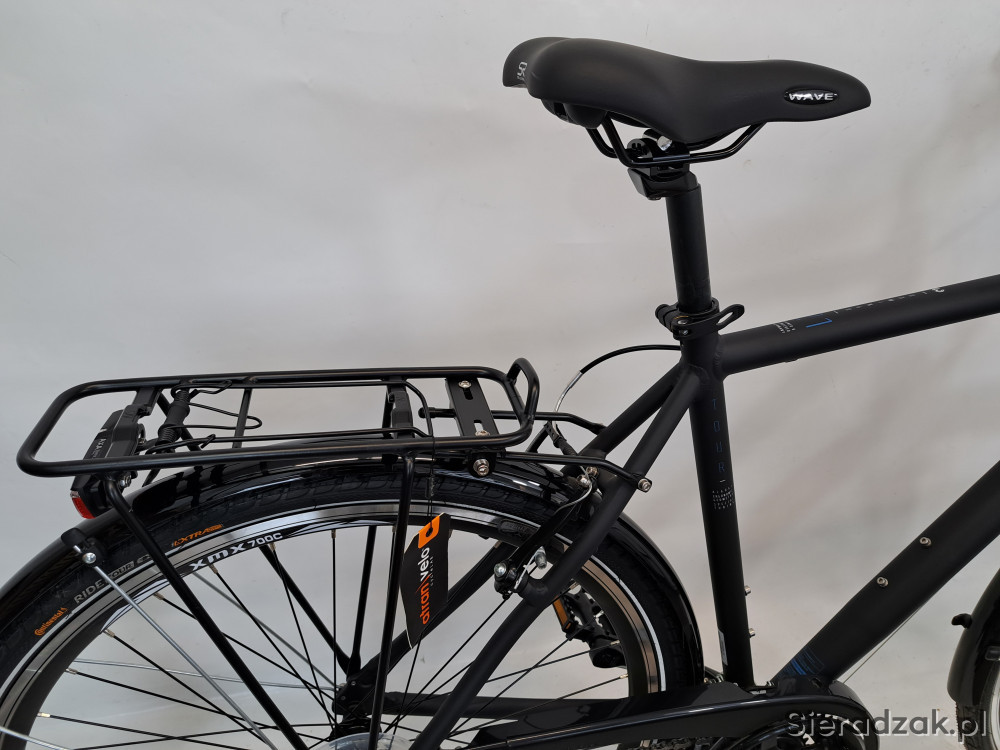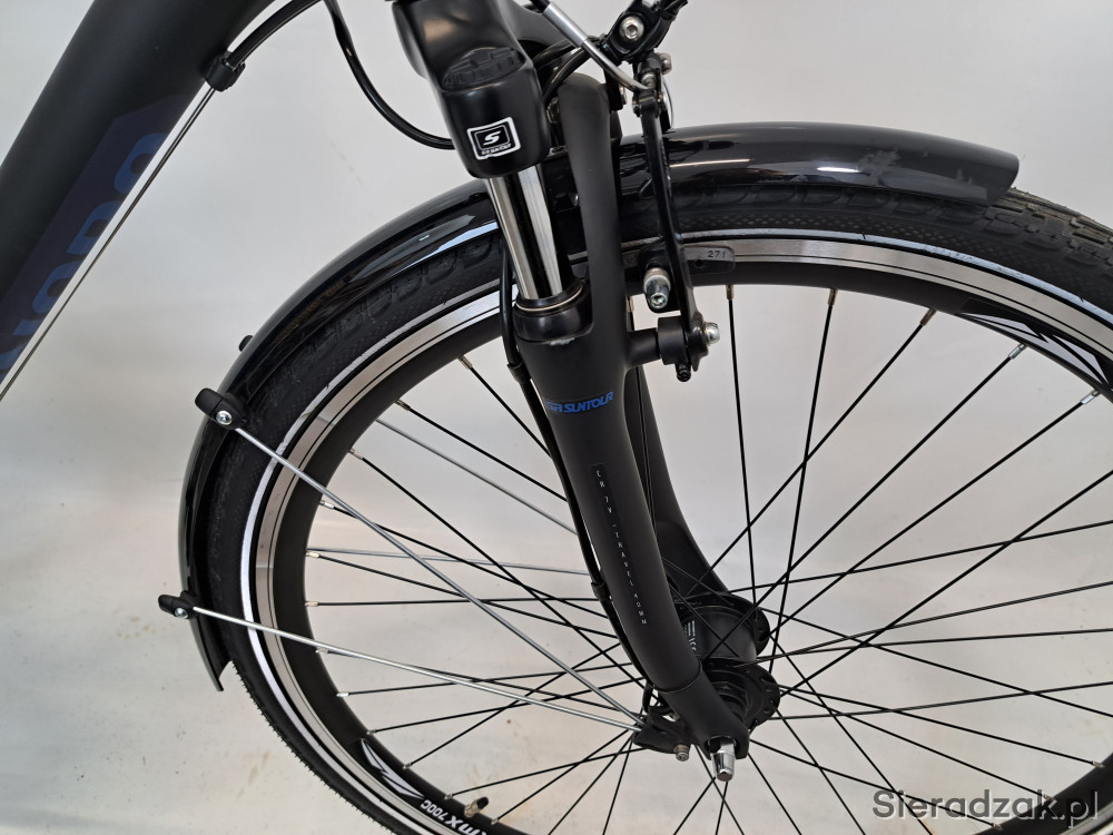rama aluminium 6061 22" 56cm,napęd 3x8,przerzutki shimano tourney,hamulce v-brake promax,klamkomanetki shimano,siodełko selle royal wave,oświetlenie led axa,dynamo shimano nexus,amortyzator sr suntour cr 7v travel.