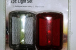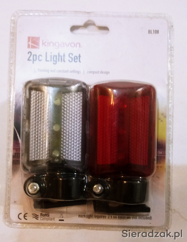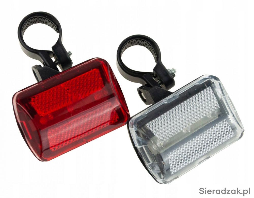 Lampki rowerowe na tył i przód, 3 ledy w każdej. Każda z lampek ma 7 funkcji: światło stałe oraz 6 funkcji migania.