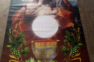 Sprzedam jak nowy baner na okoliczność Bożego ciała wymiar 100 szer na 197 wys. Piękne kolory motyw SW Józefa materiał odporny na deszcz czy . Zapraszam