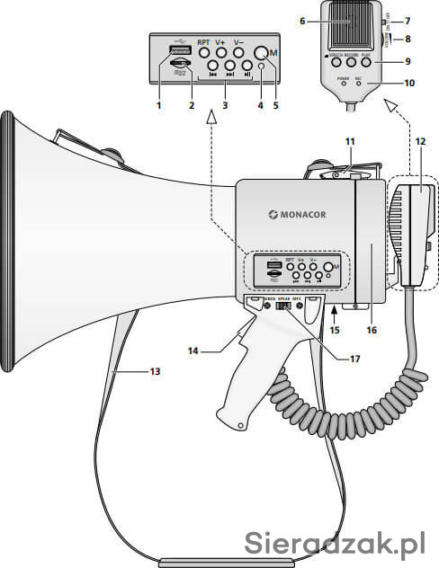 Megafon z wbudowanym odtwarzaczem MP3 USB Nagrywanie pendrive'a z którego można odtwarzać muzykę lub nagrane komunikaty.