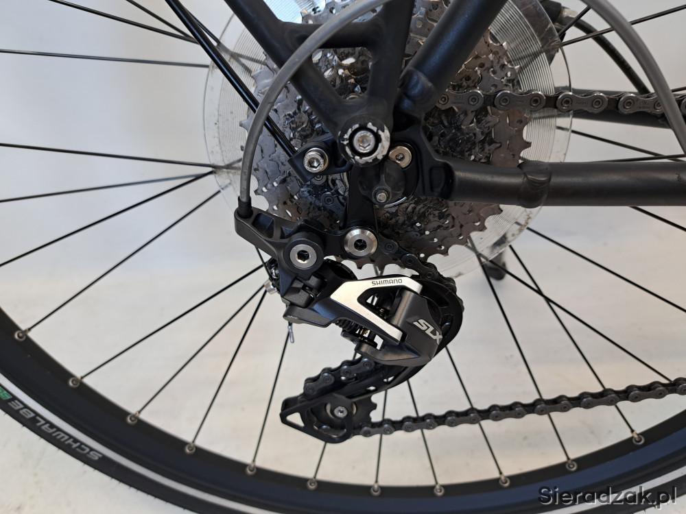 rama aluminium 55cm(XL),napęd 1x10,przerzutka shimano slx,dzwignia zmiany biegów shimano deore,hamulce hydrauliczne tarczowe shimano 180/180,amortyzator sr suntour mobie,oświetlenie ledowe zasilane z akumulatora,opony schwalbe energizer plus,piasty shimano.stan techniczny bardzo dobry,wizualnie niewielkie ślady użytkowania.