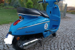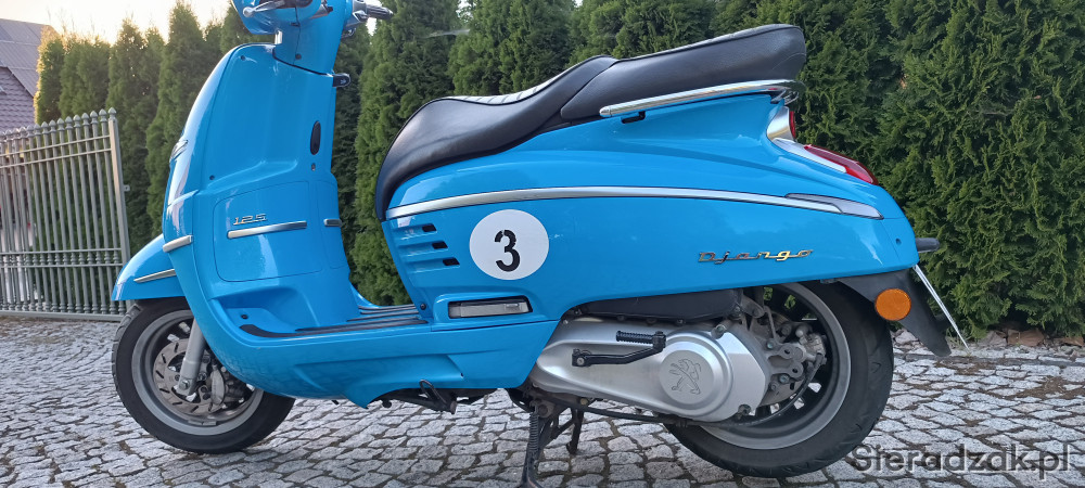 Sprzedam swojego prywatnego Peugeota Django 125. Śliczny przykuwający wzrok błękitny kolor. Wpada w oko. Skuter zarejestrowany i ubezpieczony. Beż żadnych mankamentów technicznych. Po zakupie można śmiało pojechać na kołach do domu. Prowadzi się bardzo dobrze. Średnie spalanie ok. 3l. 2 kluczyki, książka serwisowa. Polecam, na żywo wygląda jeszcze lepiej. Zapraszam do oględzin. Więcej informacji pod nr tel. 605130170 - . Posiadam również oryginalny zimowy pokrowiec na nogi oczywiście marki Peugeot.