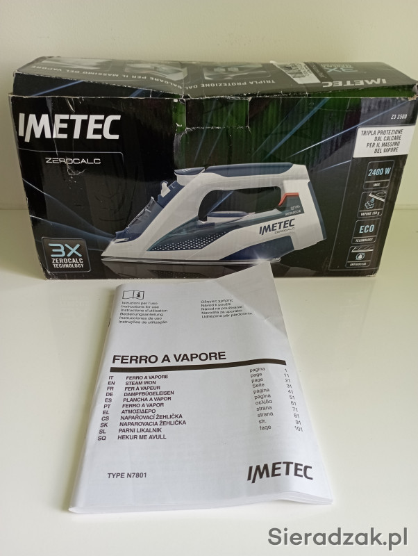 Jego główne cechy to:moc 2400W ,uderzenie pary 150g, stopa ze stali nierdzewnej, technologia Imetec Zerocalc 3X chroniąca żelazko przed osadzaniem się kamienia, 250 ml zbiornik, prasowanie w pionie, spryskiwacz . Stan- używany, ale w bardzo dobrym stanie