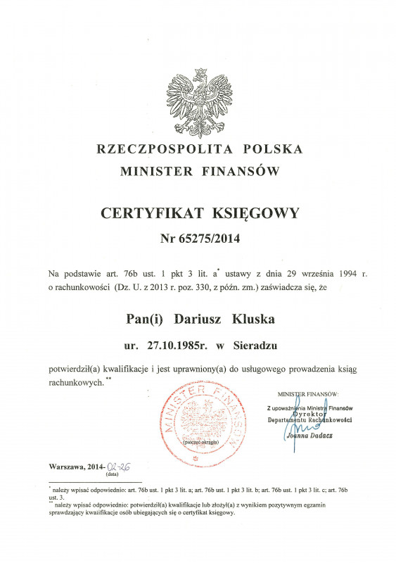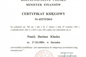 CERTYFIKAT MINISTERSTWA FINANSÓW nr. 65275/2014