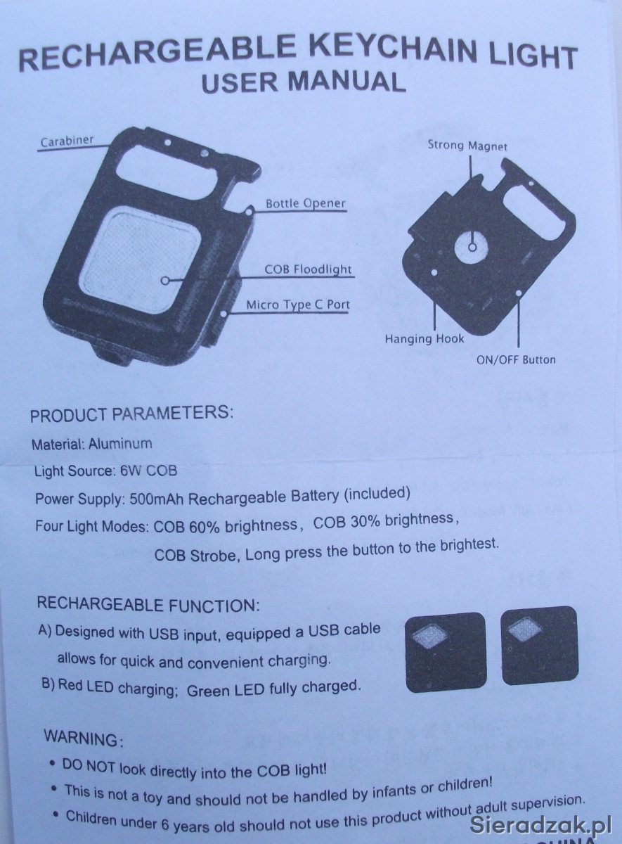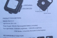 - Tryb oświetlenia: Światło - 100% (włącznik przycisnąć przez 3s); Krótkie przyciśnięcie w serii 60%, 30%, strobe