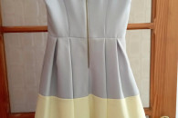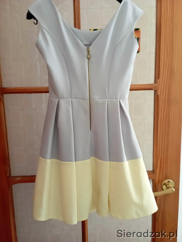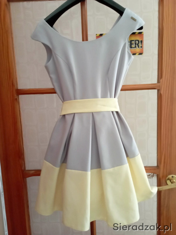 Sukienka Kolor- szaro-jasnożółty na szerokich ramiączkach z rozkloszowanym dołem, do sukienki dołączony jest ozdobny paseczek z materiału, pod sukienką znajduje się usztywniona halka, pod pachami 42cmx2, w pasie 33cmx2, długość 80cm . Rozmiar-34 .Poliester 100%, Stan- bardzo dobry