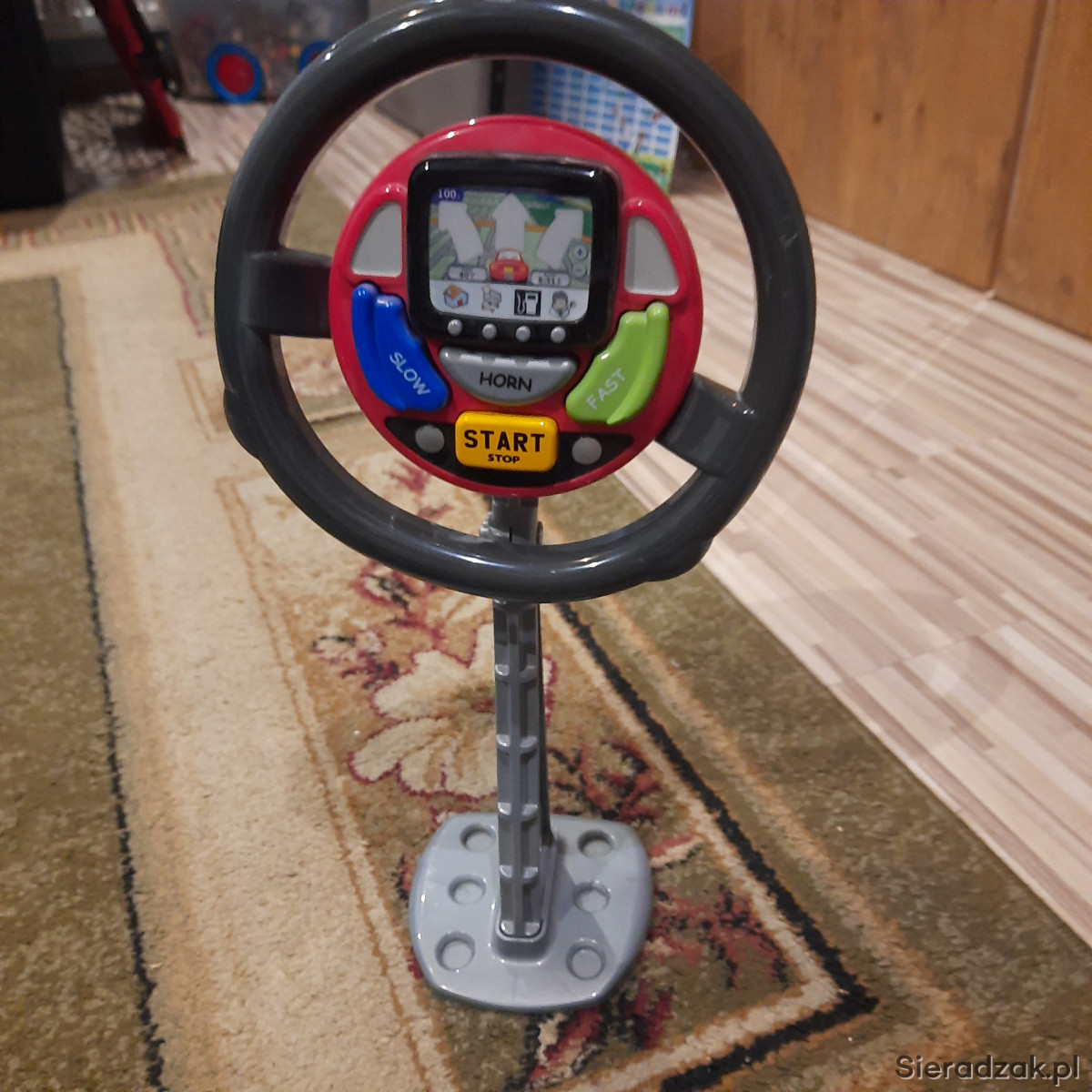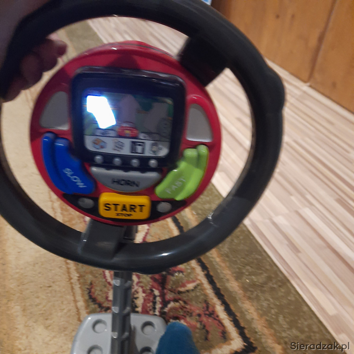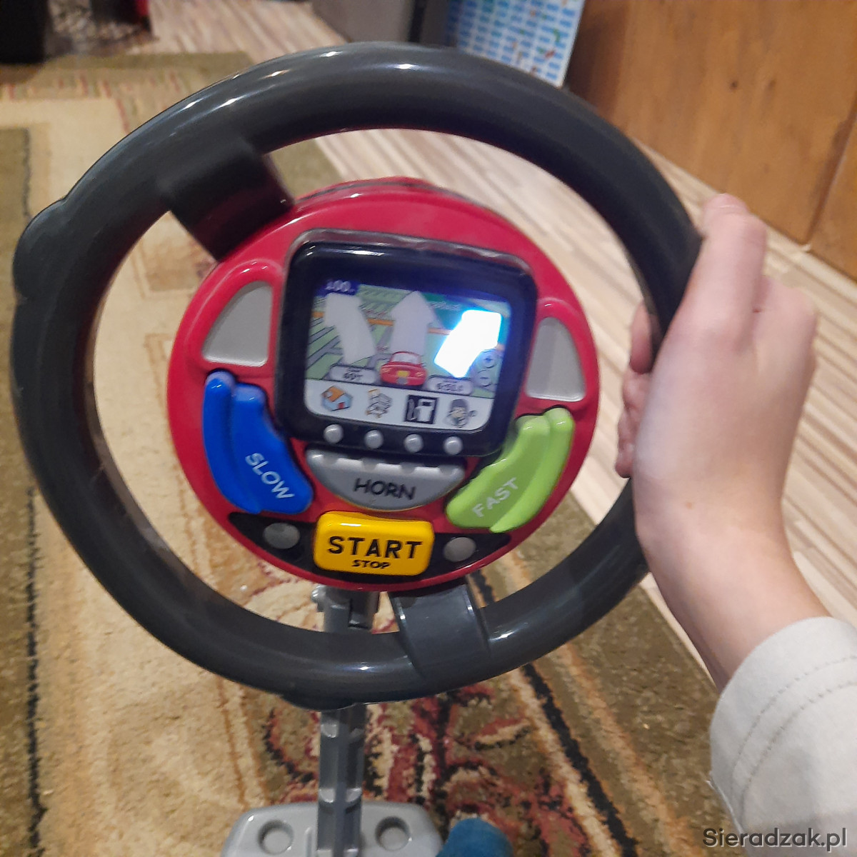 Interaktywna zabawka 3+. Nawigacja w języku angielskim pomoże w pewnym zakresie nauczyć tego języka. Zabawka wyposażona jest w inne funkcje: przyspieszanie, hamowanie czy klakson. Bez pudełka.