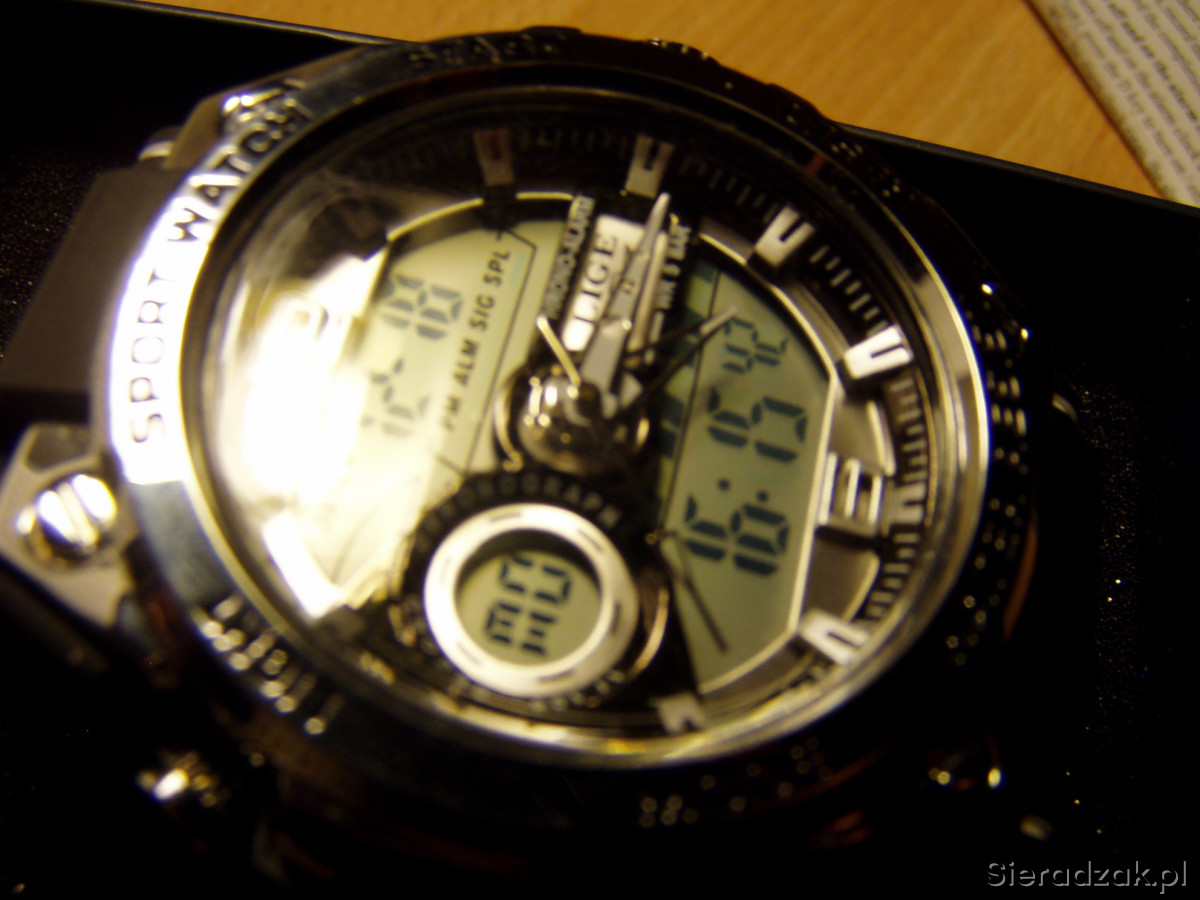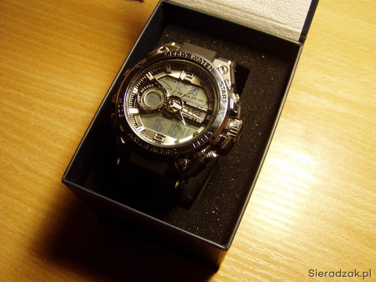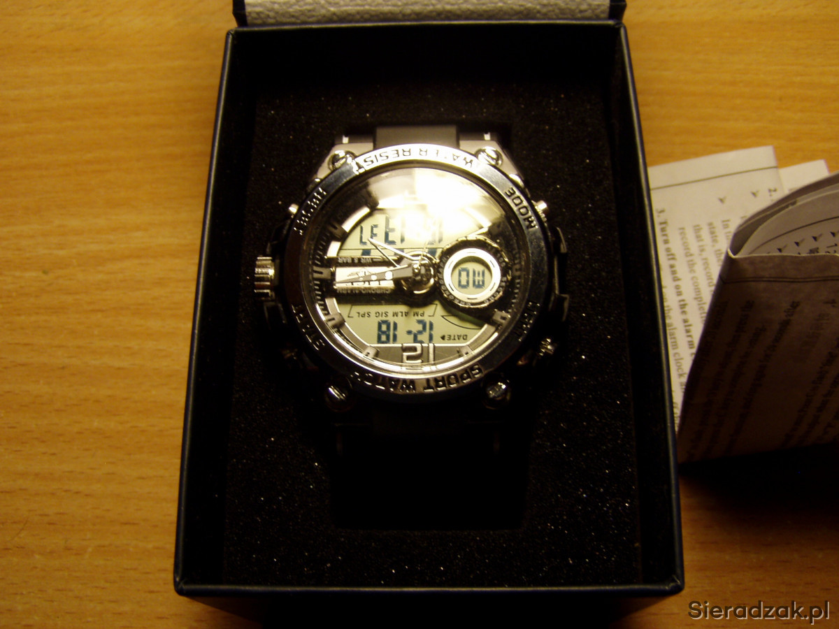 Cyferblat analogowo-cyfrowy, wyświetlacz LED wskazujący czas, tydzień i datę, odporny na uderzenia, ze stoperem i budzikiem, format 12 lub 24-godzinny, podświetlenie tła. Polecam!!!