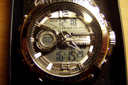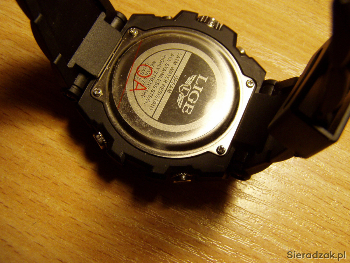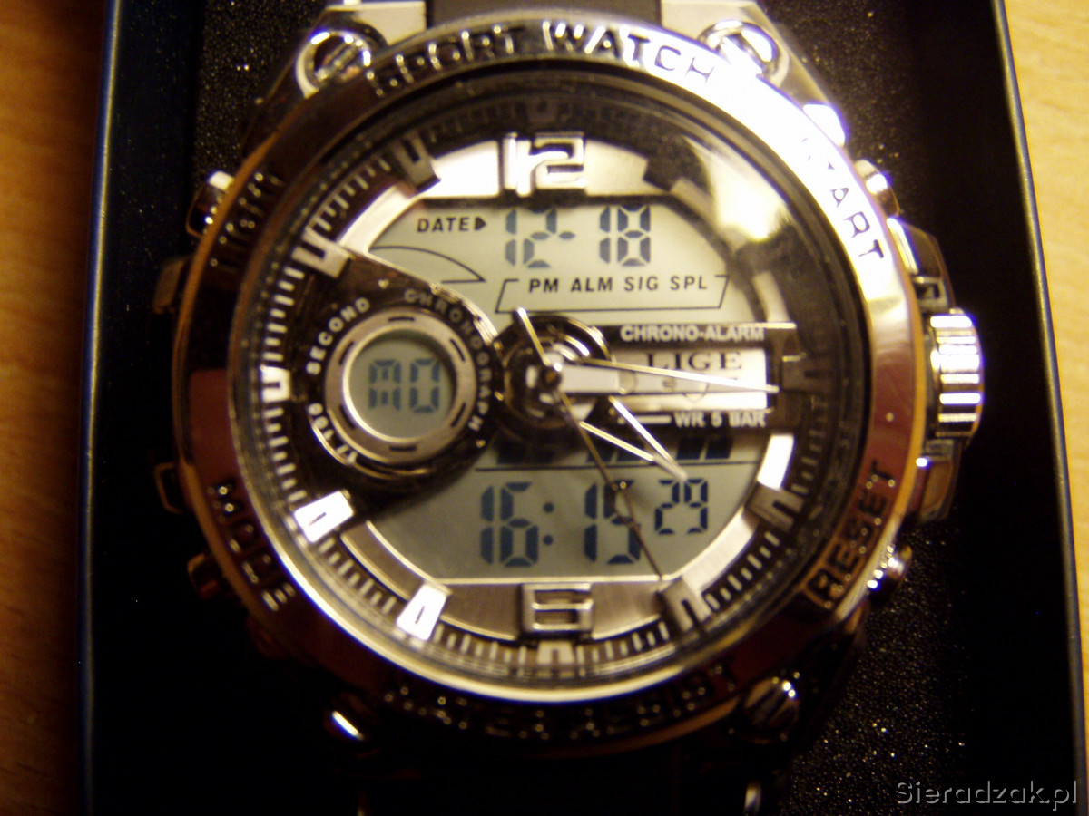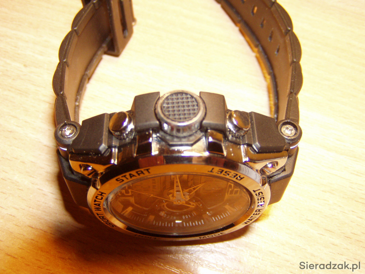 Cyferblat analogowo-cyfrowy, wyświetlacz LED wskazujący czas, tydzień i datę, odporny na uderzenia, ze stoperem i budzikiem, format 12 lub 24-godzinny, podświetlenie tła. Polecam!!!