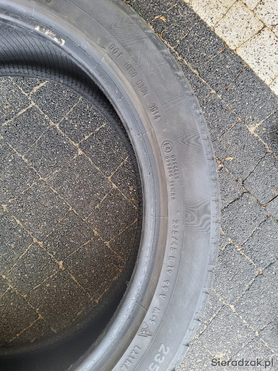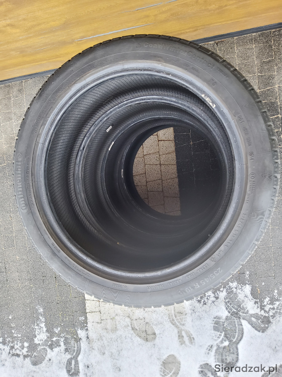 Sprzedam komplet 4 opon zimowych Continental Conti Winter Contact TS 830 P w rozmiarze 235 45 R19 99V. Opony posiadają rant ochronny, wzmocnienie (XL) MO-Mercedes-Benz, przyczepność na śniegu (3PMSF). DOT opon: 2x3514, 2x4714, wysoki bieżnik. Opony w stanie dobrym- jak na zdjęciach.
