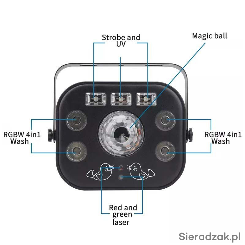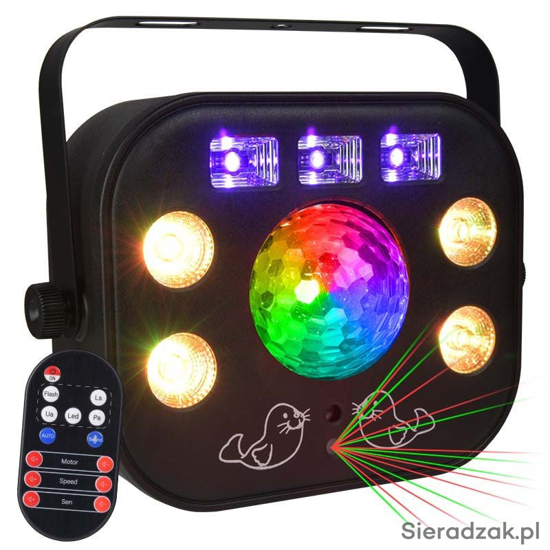 Połączenie 4-efektów w jednej obudowie: Kula disco+Laser+Stroboskop+UV. Dzięki temu posiada duże możliwości pracy w każdych warunkach. Każdy użytkownik będzie z pewnością zadowolony mając możliwość użycia wszystkich efektów na każdej imprezie.