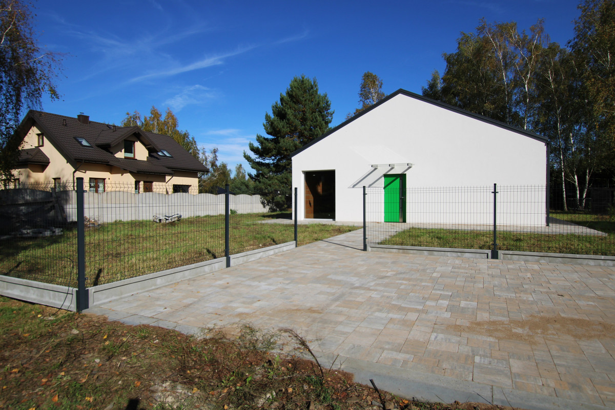 Działka częściowo zagospodarowana kostką brukową. Wybrukowano podjazd przed domem, opaskę wokół domu oraz taras znajdujący się z tyłu budynku.