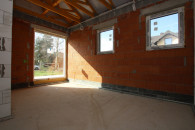 Dom położony na ławach fundamentowych betonowych z betonu oraz bloczków betonowych o szerokości 24 cm. Ściany nośne wybudowane z bloczków gazobetonowych o grubości 24 cm, ocieplone styropianem 18 cm oraz otynkowane tynkiem strukturalnym. Dach wykonany z więźby drewnianej, pokryty dachówką w kolorze antracytowym.
