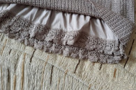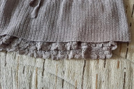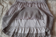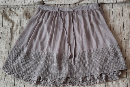 Witam. Do sprzedania: fantazyjna, bardzo dziewczęca SPÓDNICA na podszewce (z falbaną), zakończona szerokim przetykanym/haftowanym wzorem, z boku suwak, w pasie ściągana troczkami (obwód regulowany). Przybliżone wymiary: długość całkowita 45 cm, obwód pasa max. 86 cm. Kolor beżowy/kawa z mlekiem (podszewka tego samego koloru), rozmiar M. Spódnica bardzo efektowna, ślicznie prezentuje się w ruchu, można prać w pralce, stan bardzo dobry – jak nowa. Cena 25 zł. + 9 zl. koszty wysyłki. Tel. 507-694-505.