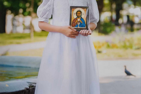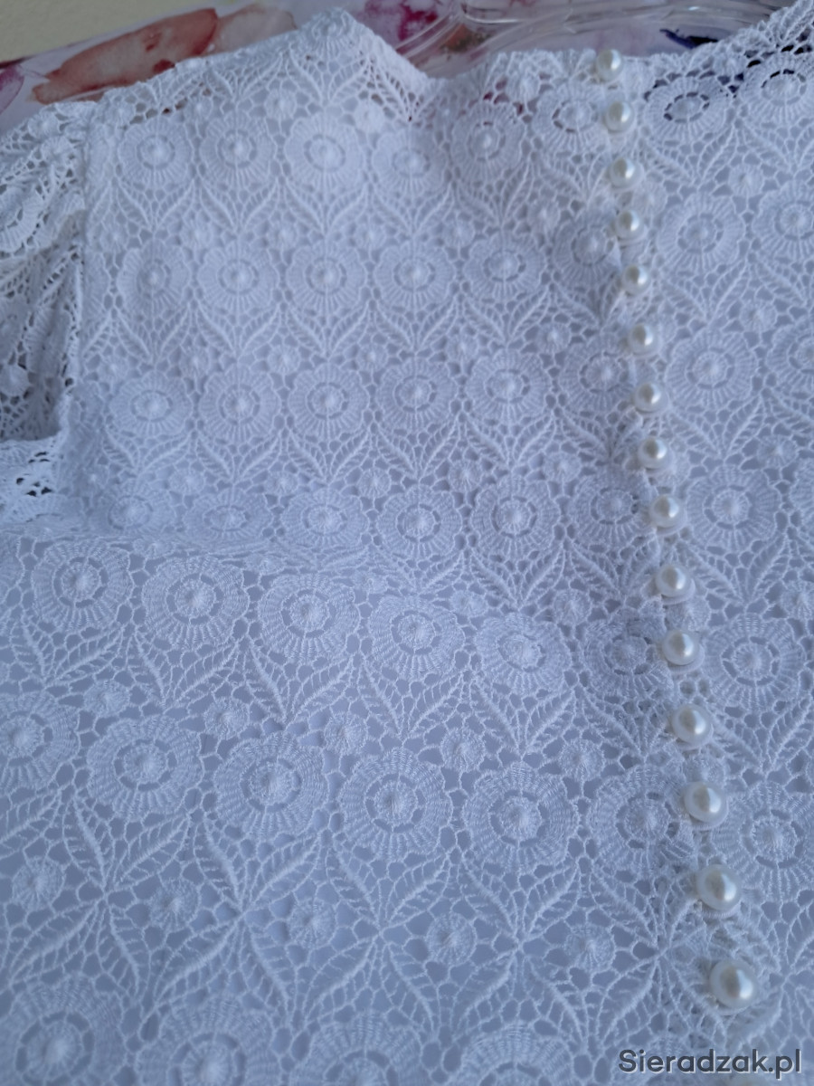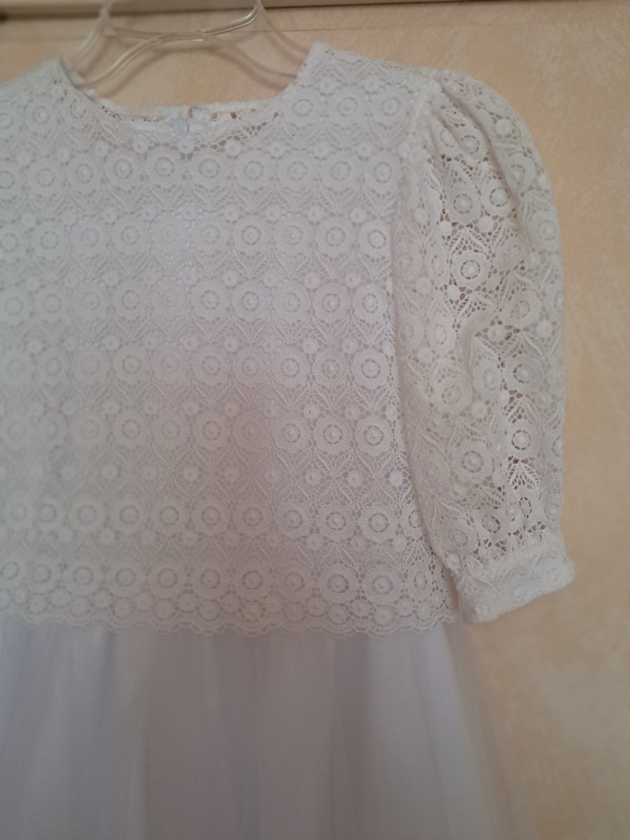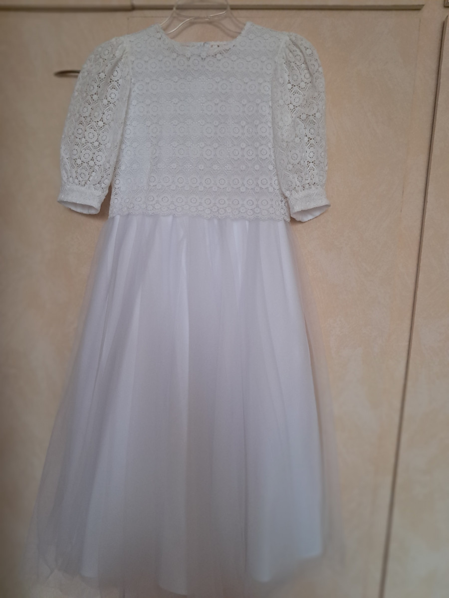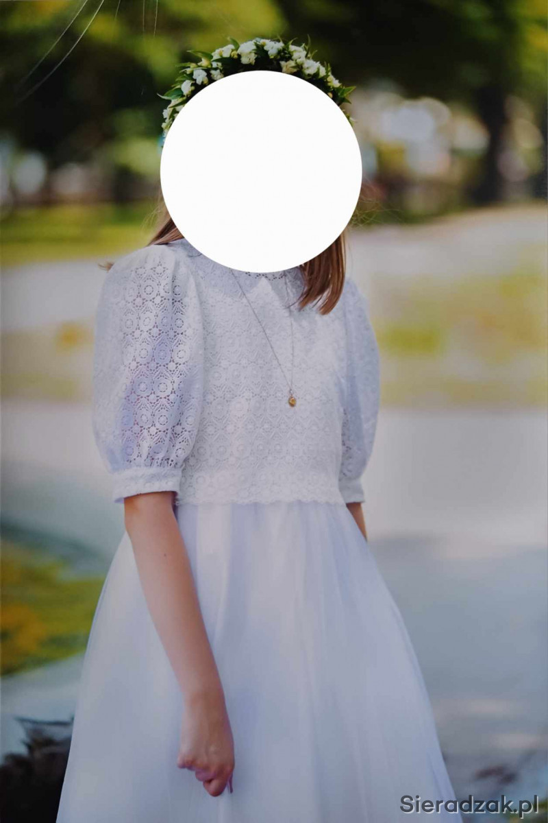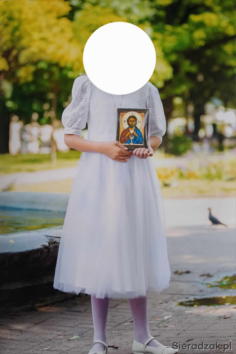 Sukienka komunijna na wysoką dziewczynkę 146 - 152 cm. Uszyta jest z tafty a dół sukienki dodatkowo z delikatnego tiulu. Góra sukienki to nakładana bluzka, którą można wykorzystać jako elegancką bluzeczkę na okazje uszyta jest z oryginalnej bawełnianej gipiury. Z tyłu zapinana na rząd perełek. Możliwość dopasowania do sylwetki dziecka w cenie sukienki