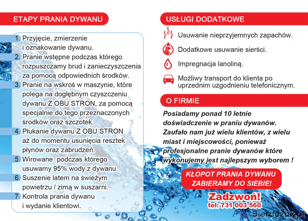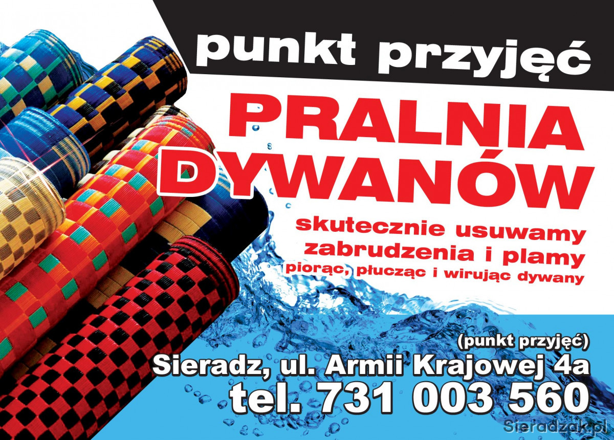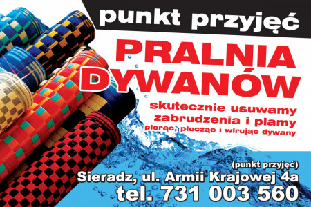 Dzięki naszej firmie mogą Państwo się cieszyć perfekcyjnym dywanem przez cały rok, wystarczy dostarczyć go do naszego Punktu Przyjęć Dywanów na ul. Armii Krajowej 4a w Sieradzu a my zajmiemy się resztą, w dniu odbioru dywanu zostaną Pańśtwo poinformowani o możliwości odbioru, płatność następuje dopiero po wykonanej usłudze.