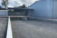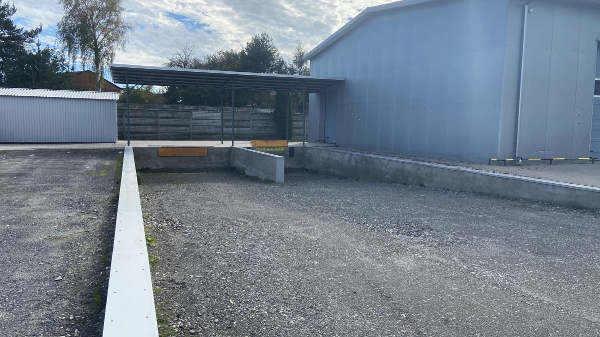 Kompletnie ogrodzona powierzchnia 0,5 Ha z wybrukowanym frontem jest zamykana bramą sterowaną pilotem.