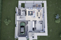 PARTER: przestrony salon z wyjściem na taras oraz otwartą kuchnią, łazienka, przedpokój, garaż oraz kotłownia