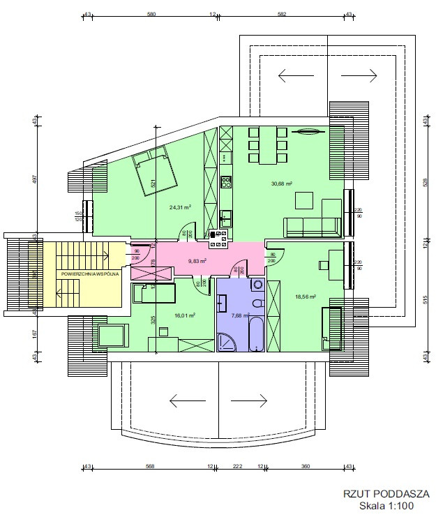 Położony na 2 piętrze, o powierzchni 105 m², oferuje przestronny salon z aneksem kuchennym (30,5 m²),