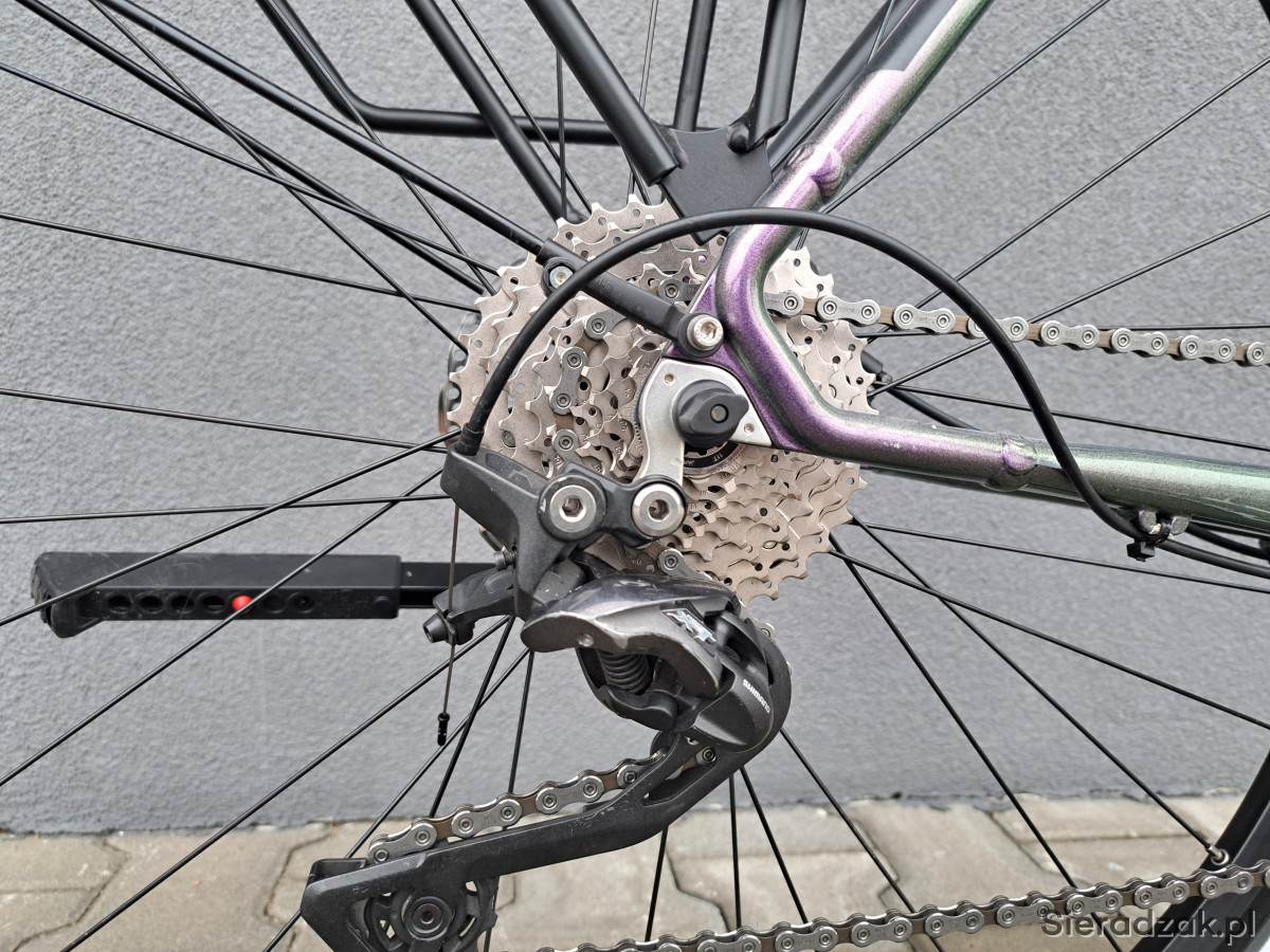 rama aluminium 6061 22" 56cm,napęd 1x10,przerzutka shimano deore xt,dzwignia zmiany biegów shimano deore,hamulce hydrauliczne tarczowe shimano,dynamo shimano w przednim kole,oświetlenie led lumotec,amortyzator sr suntour ncx.