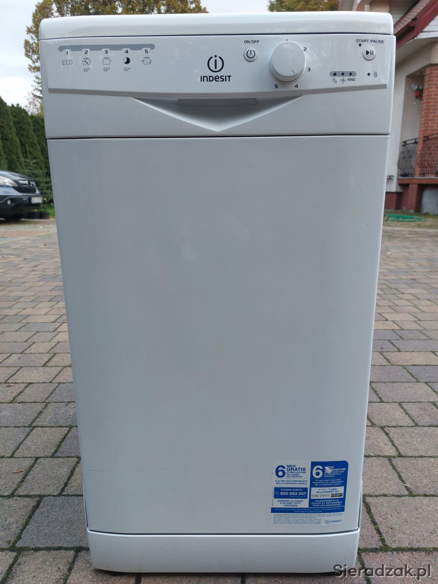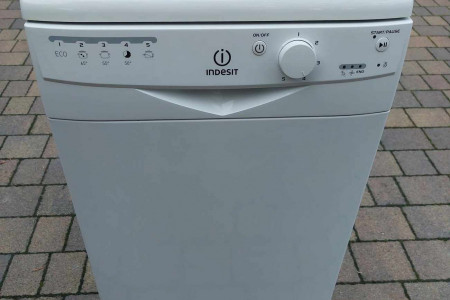 Zmywarka wolnostojąca Indesit DSR 15B1 w kolorze białym. Sterowana pokrętłem oraz przyciskami. Pomocnym rozwiązaniem są wskaźniki, które informują o konieczności uzupełnienia braku soli czy nabłyszczacza.