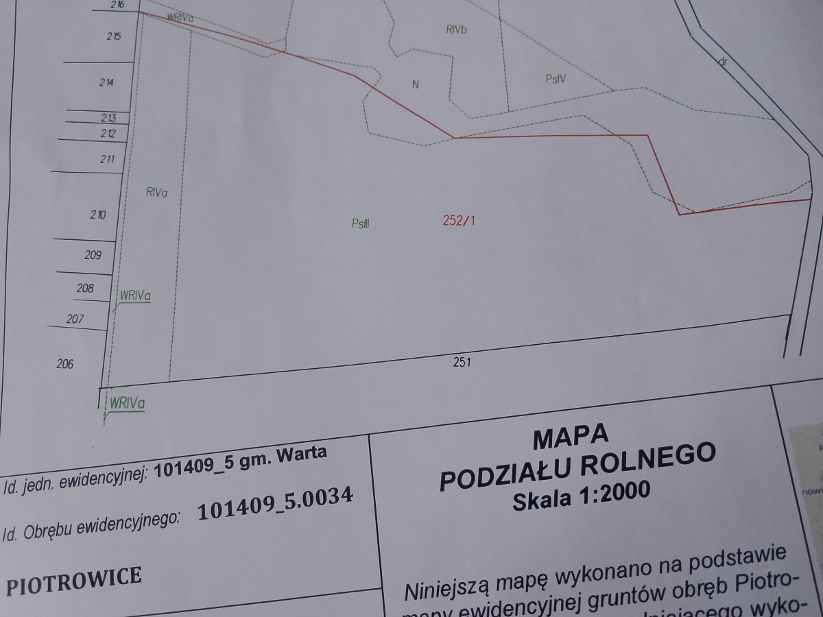 Sprzedam działkę rolną o powierzchni 3.08 ha w miejscowości Piotrowice gmina warta działka 252/1 ziemia III i IV klasy możliwość podłączenia prądu tel 516 265 536 lub 725 471 272 cena do negocjacji
